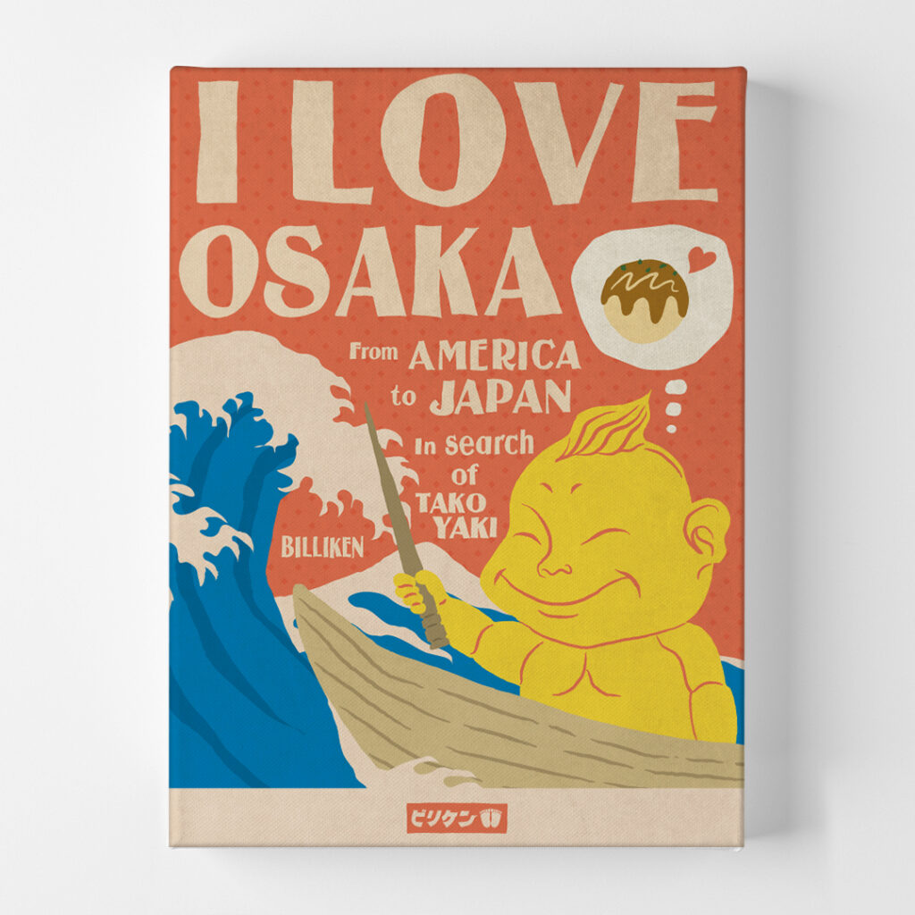 アメリカから、荒波にもまれながら、タコヤキを求めて日本へ来たビリケンの姿を表現